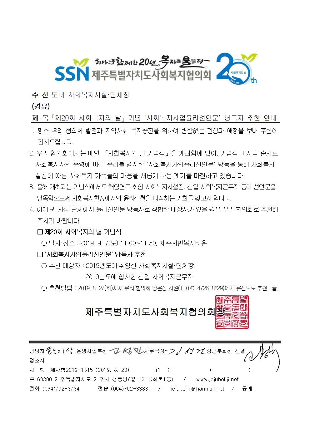 「제20회 사회복지의 날」기념 ‘사회복지사업윤리선언문’ 낭독자 추천 안내