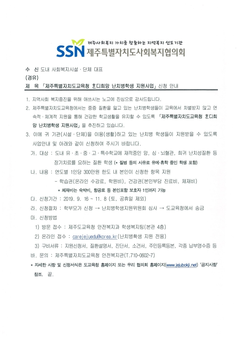 「도교육청 혼디희망 난치병학생 지원사업」신청안내