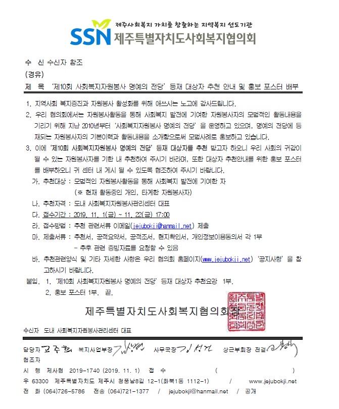 '제10회 사회복지자원봉사 명예의 전당' 등재 대상자 추천 안내