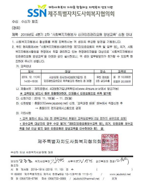 2019년도 4분기 2차 '사회복지자원봉사 신규인증관리요원 양성교육' 참가 신청 안내