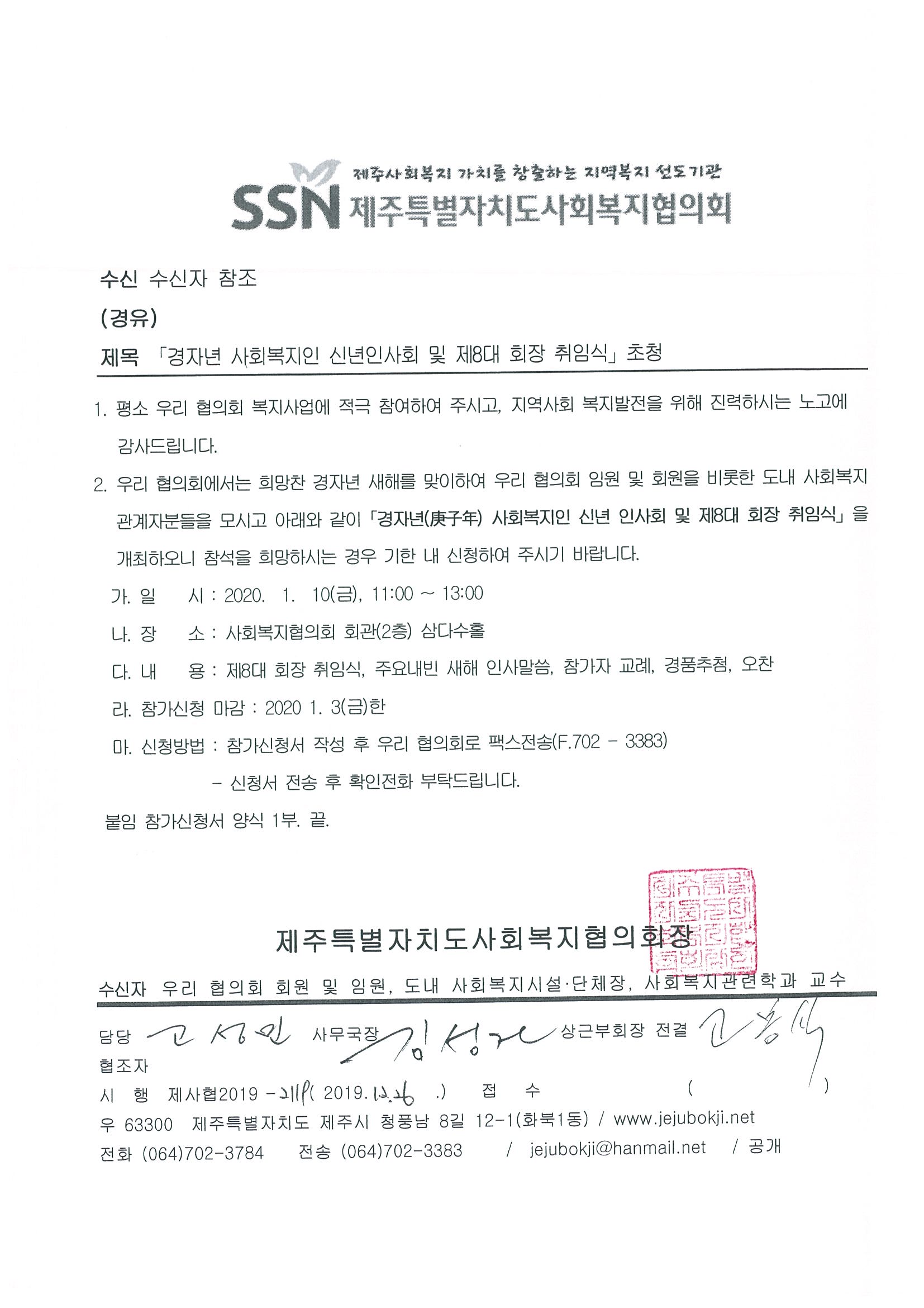 경자년 사회복지인 신년인사회 및 제8대 회장 취임식 초청