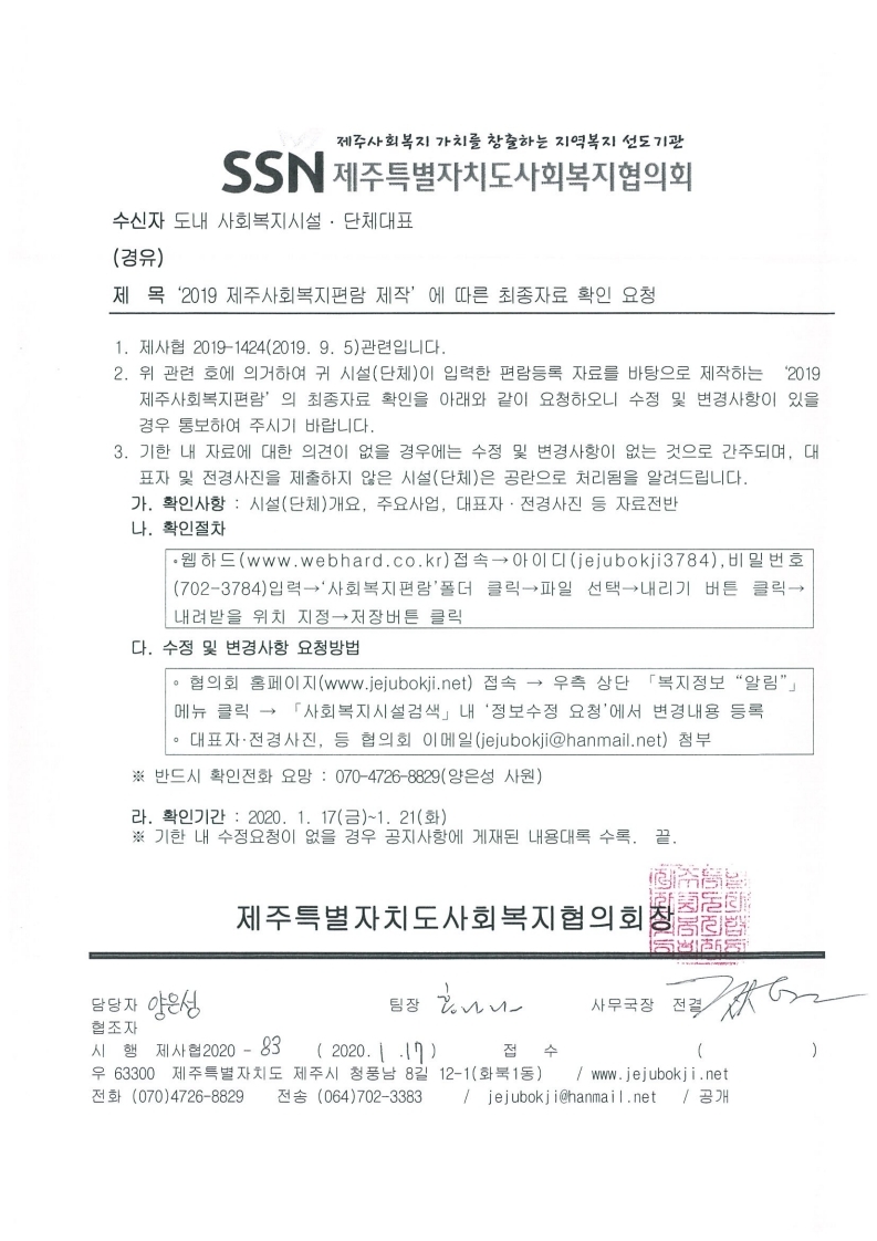 '2019 제주사회복지편람 제작' 에 따른 최종자료 확인 요청