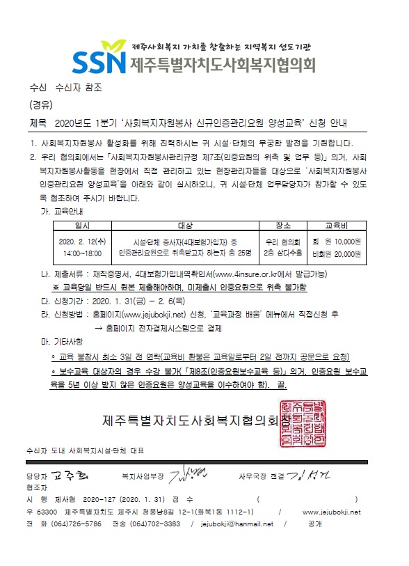 2020년도 1분기 '사회복지자원봉사 신규인증관리요원 양성교육' 신청 안내