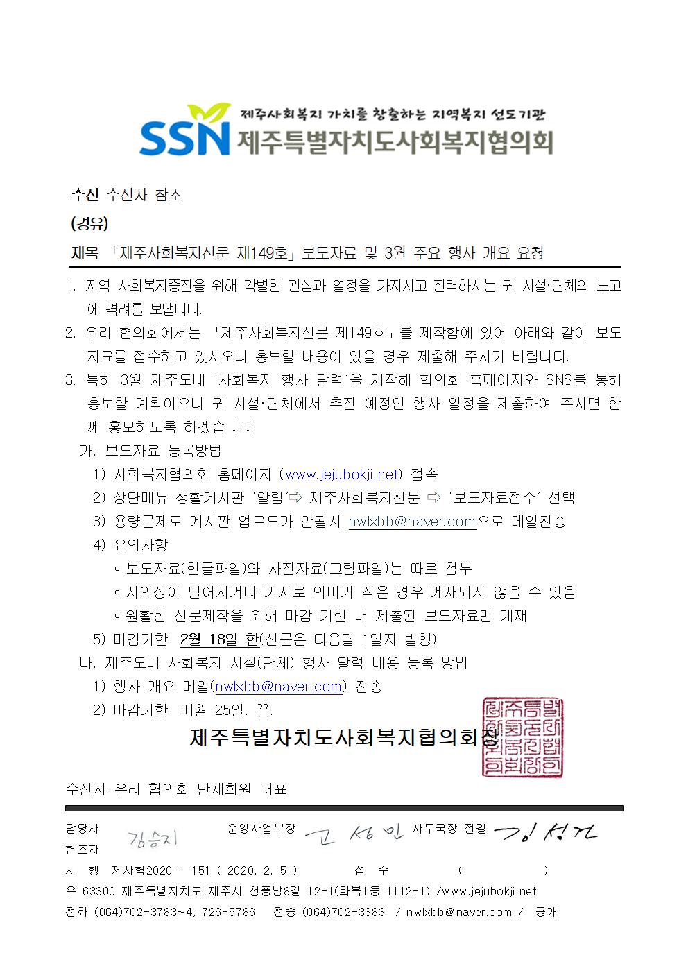 .제주사회복지신문 제149호 보도자료 및 3월 주요 행사 개요