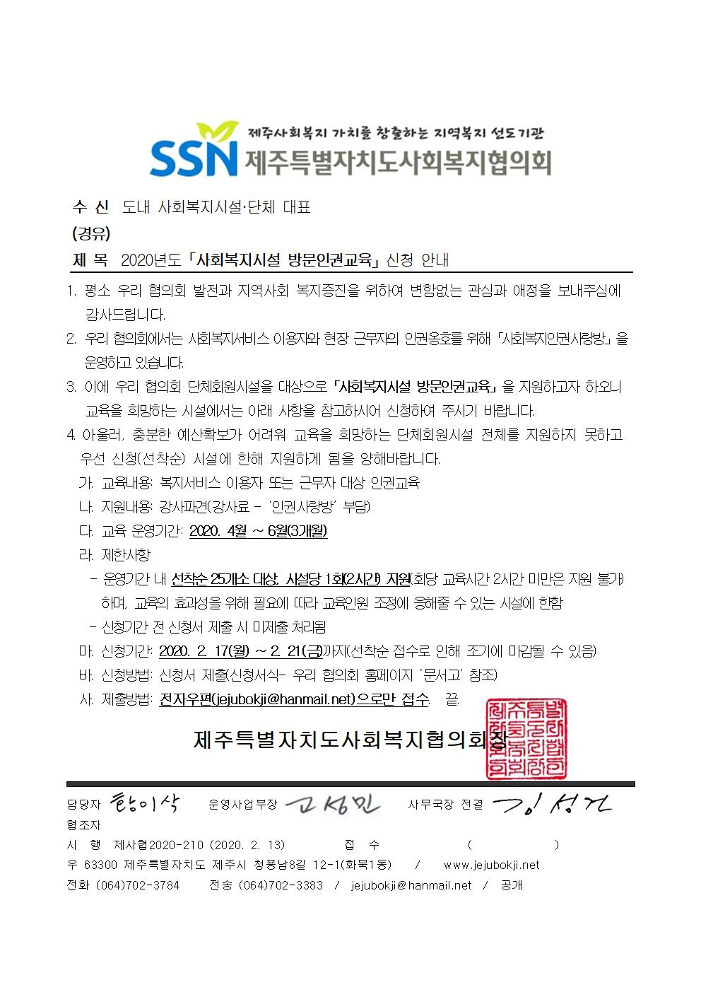 (선착순 마감됐습니다)2020년도「사회복지시설 방문인권교육」신청 안내