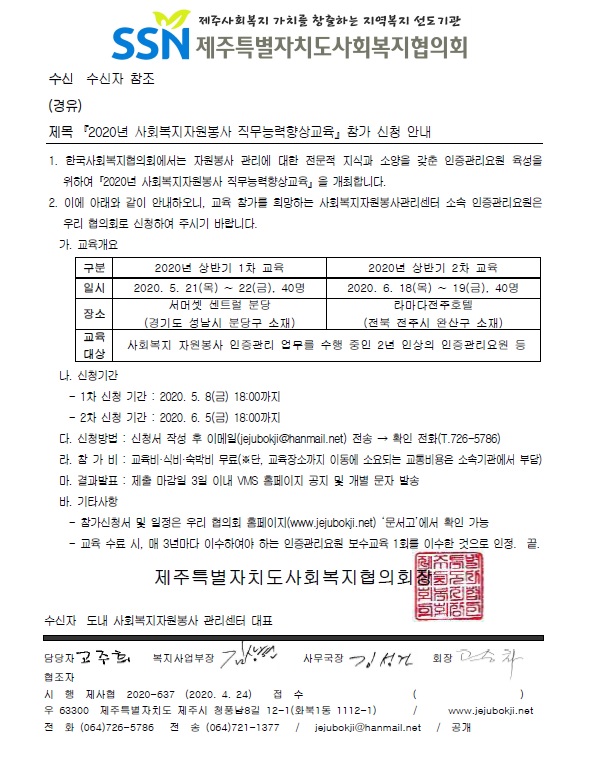 2020년 사회복지자원봉사 직무능력향상교육 참가신청 안내