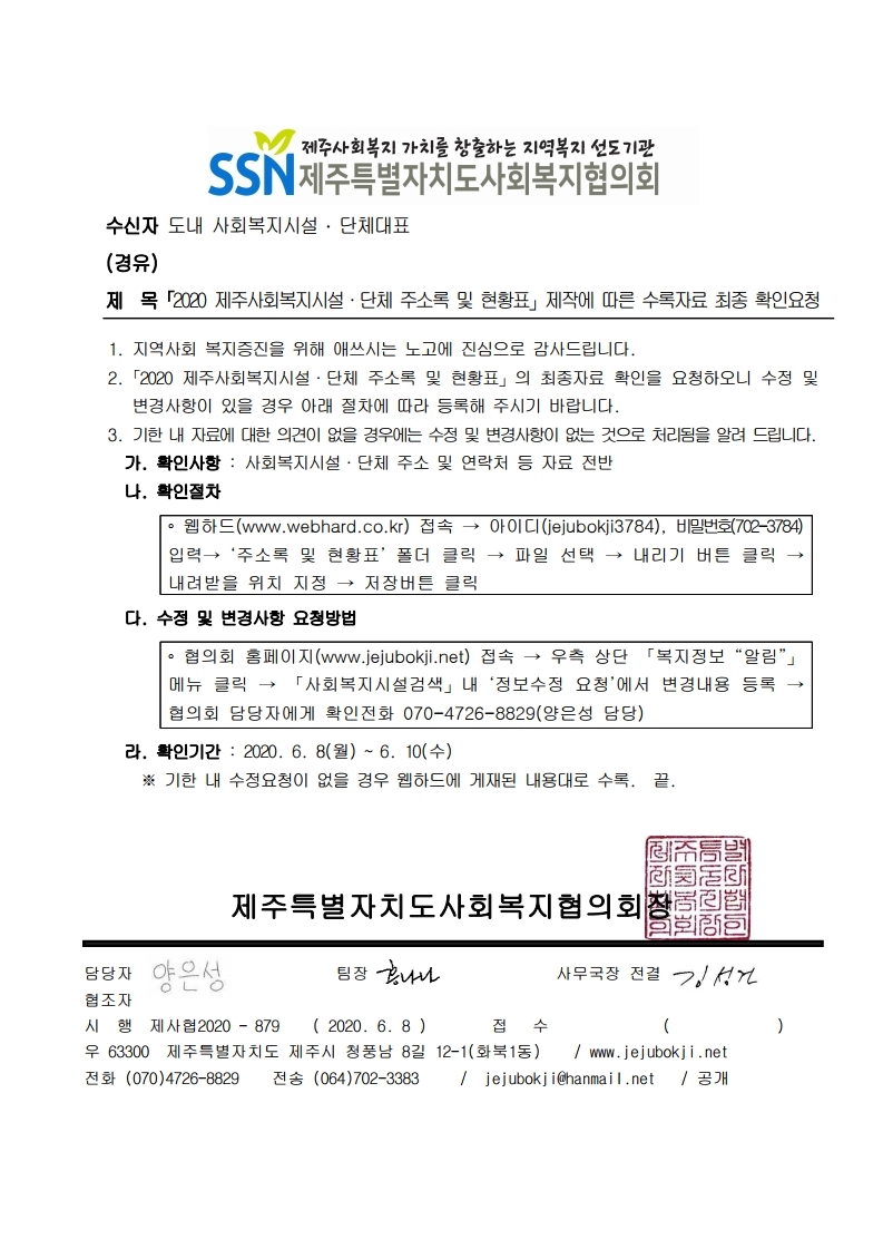 「2020 제주사회복지시설·단체 주소록 및 현황표」제작에 따른 수록자료 최종 확인요청