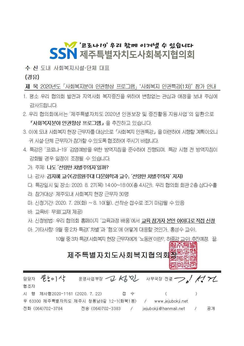 2020년도「사회복지분야 인권향상 프로그램」‘사회복지 인권특강(1차)’ 참가 안내