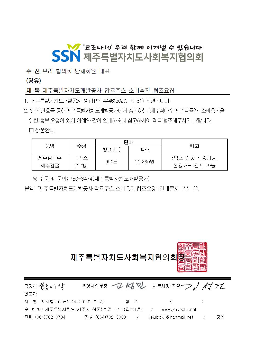 제주특별자치도개발공사 감귤주스 소비촉진 협조요청