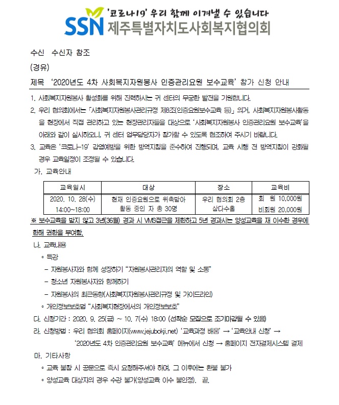 2020년도 4차 사회복지자원봉사 인증관리요원 보수교육 참가 신청 안내