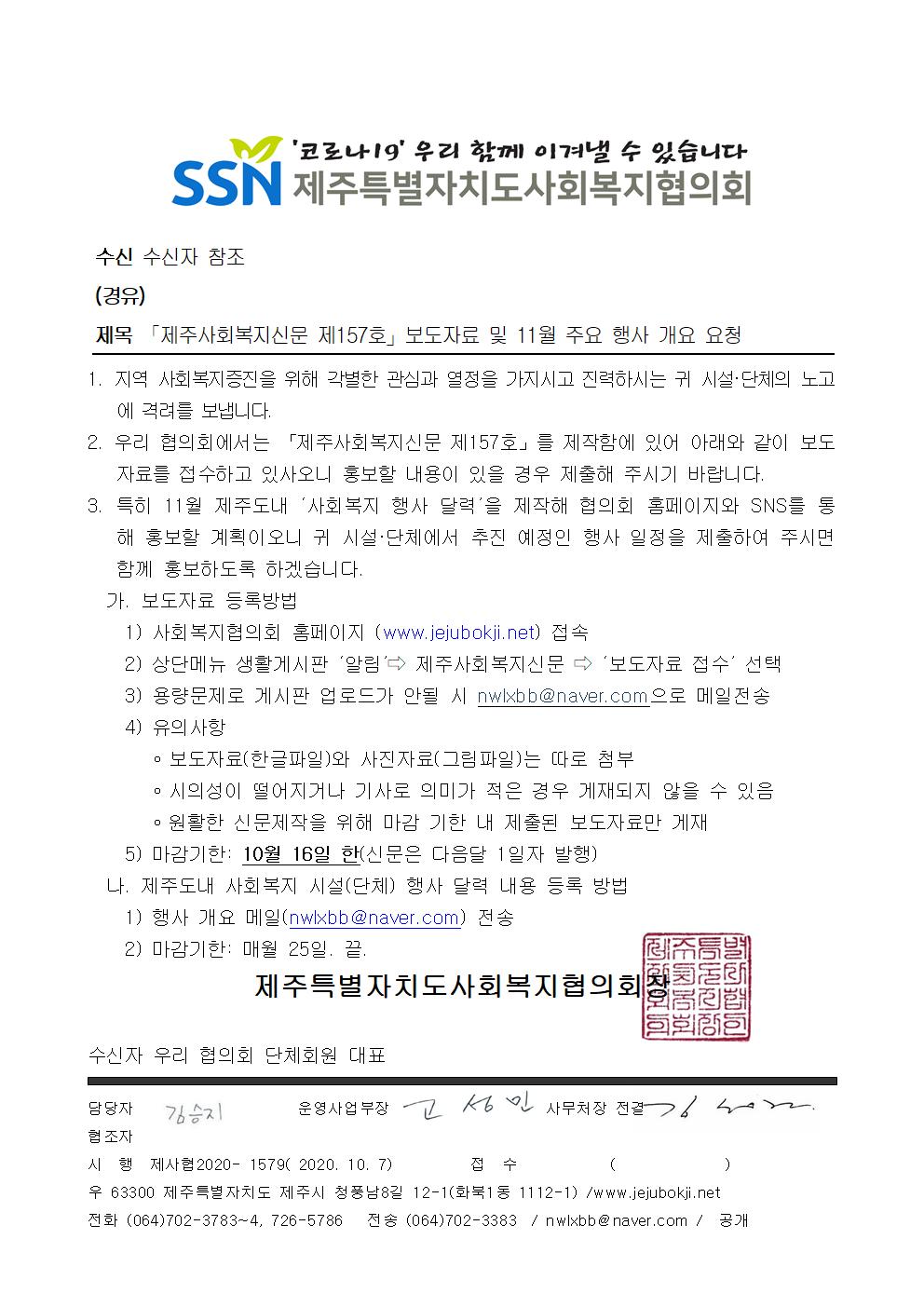 제주사회복지신문 제157호 보도자료 및 11월 주요행사개요 요청