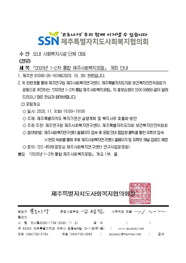 「2020년 1-2차 통합 제주사회복지포럼」 개최 안내