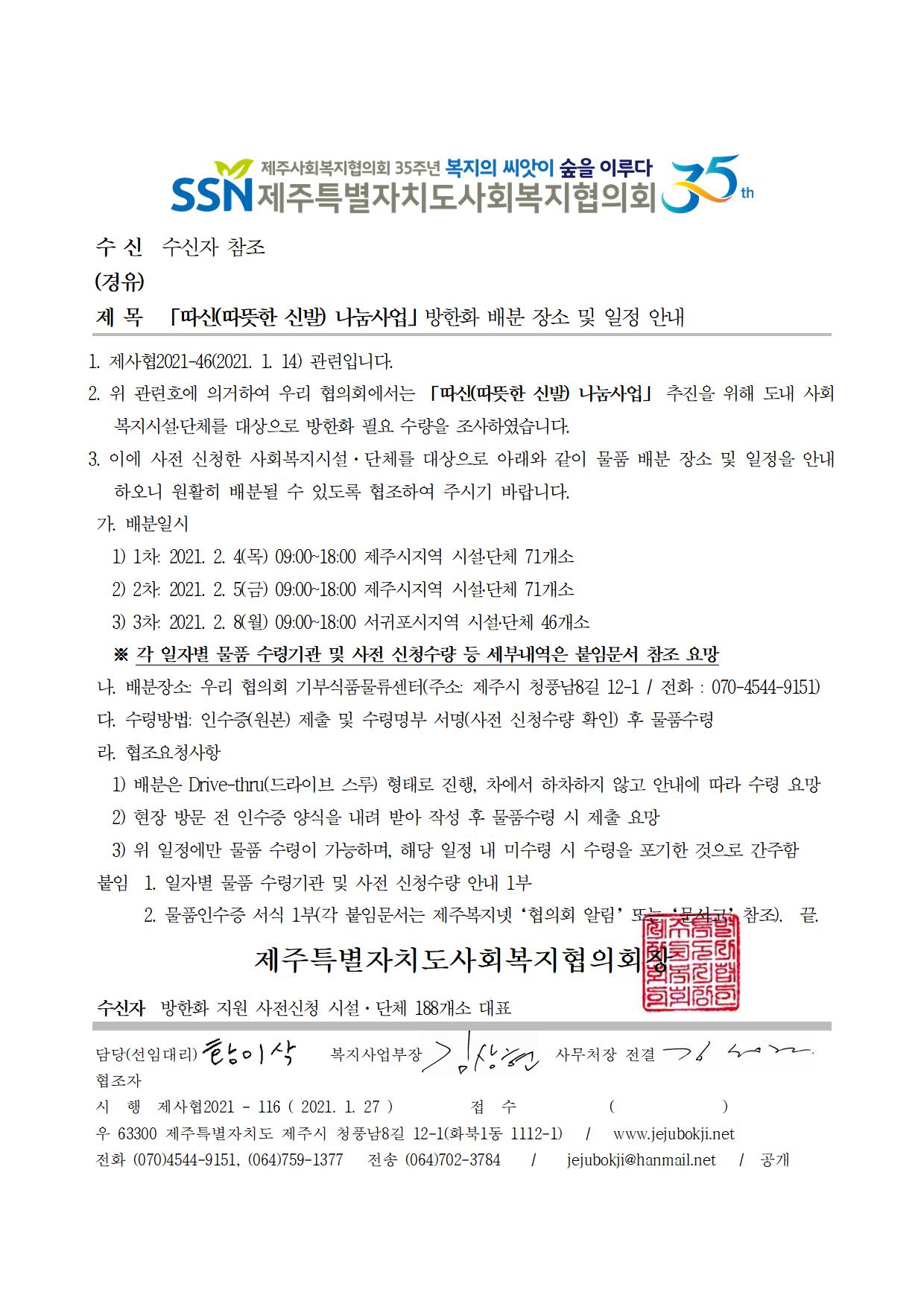 「따신(따뜻한 신발) 나눔사업」방한화 배분 장소 및 일정 안내