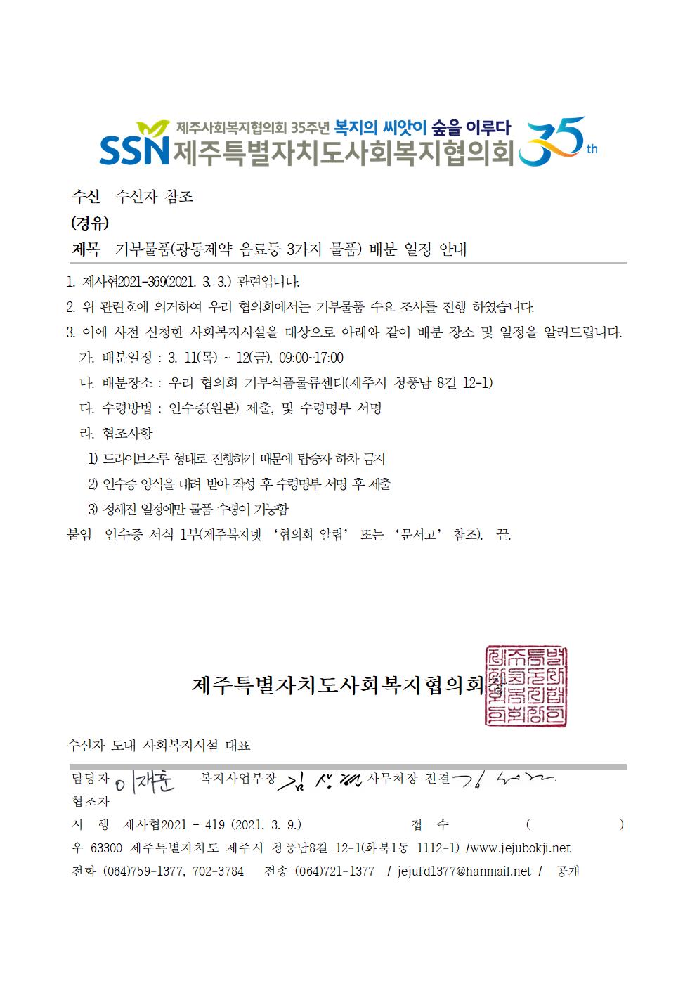 기부물품(광동제약 음료등 3가지 물품) 배분 일정 안내