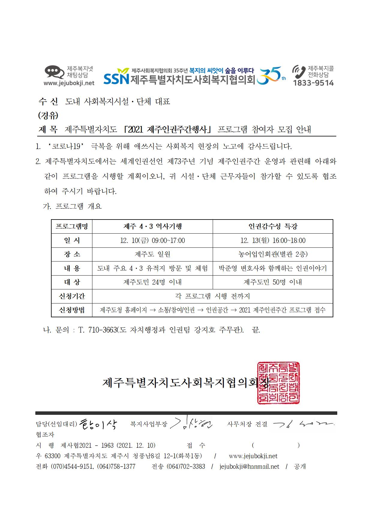 제주특별자치도 「2021 제주인권주간행사」 프로그램 참여자 모집 안내