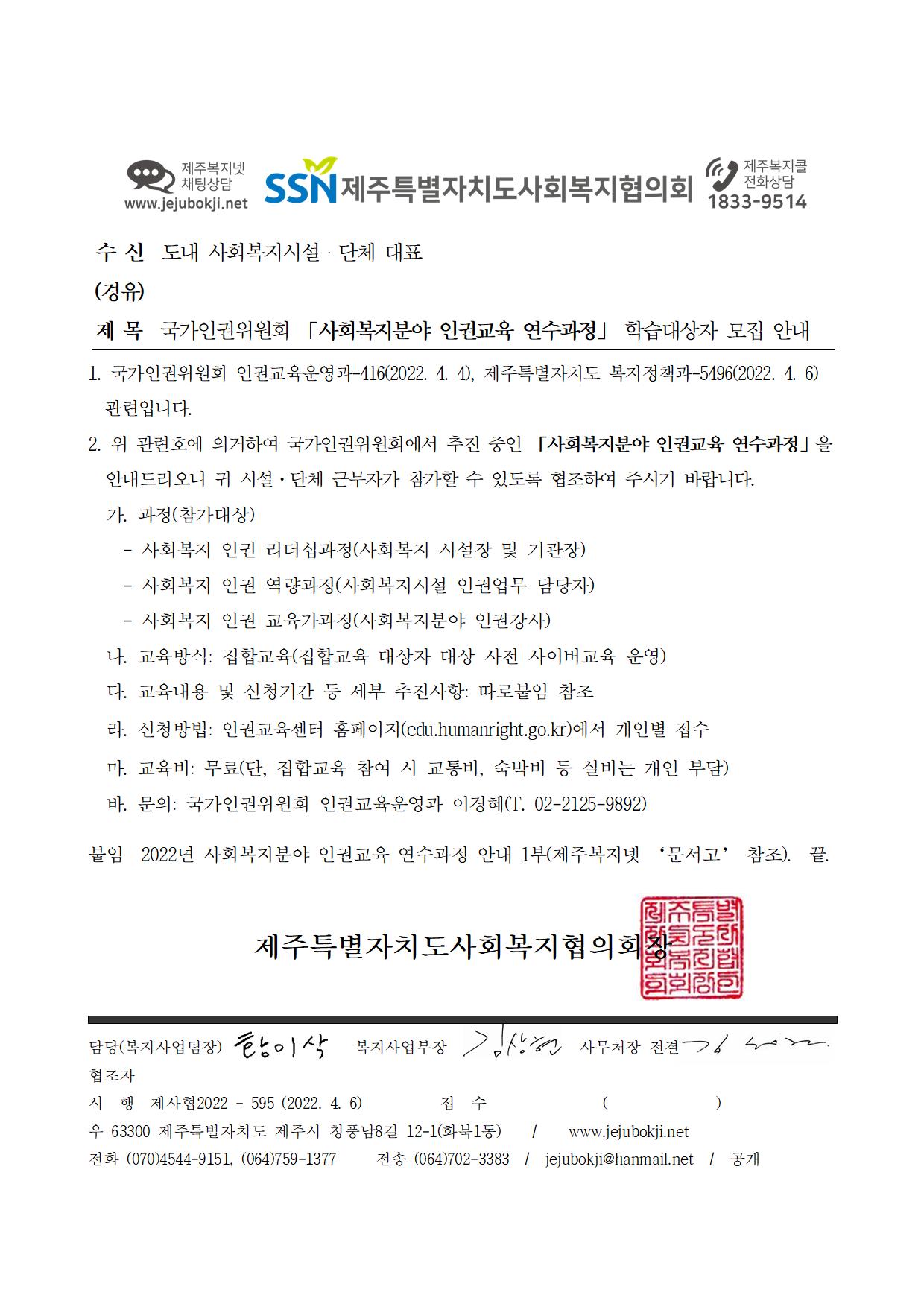 국가인권위원회 「사회복지분야 인권교육 연수과정」 학습대상자 모집 안내
