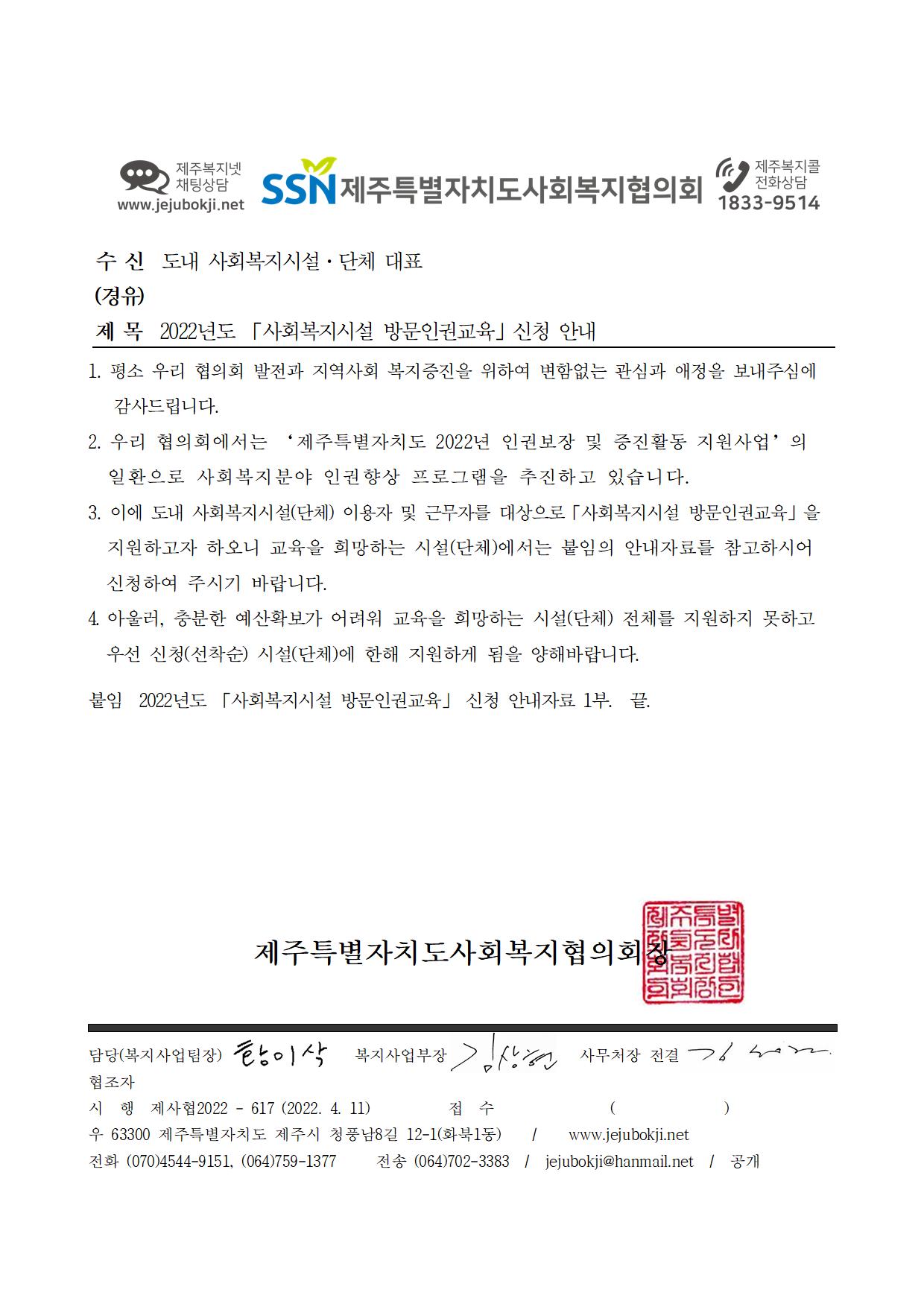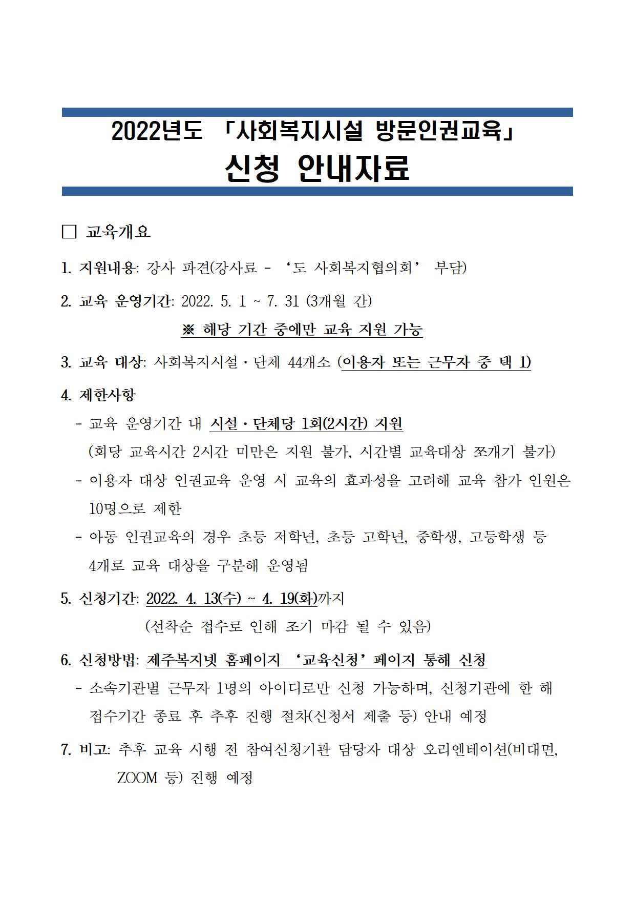 2022년도 「사회복지시설 방문인권교육」 신청 안내