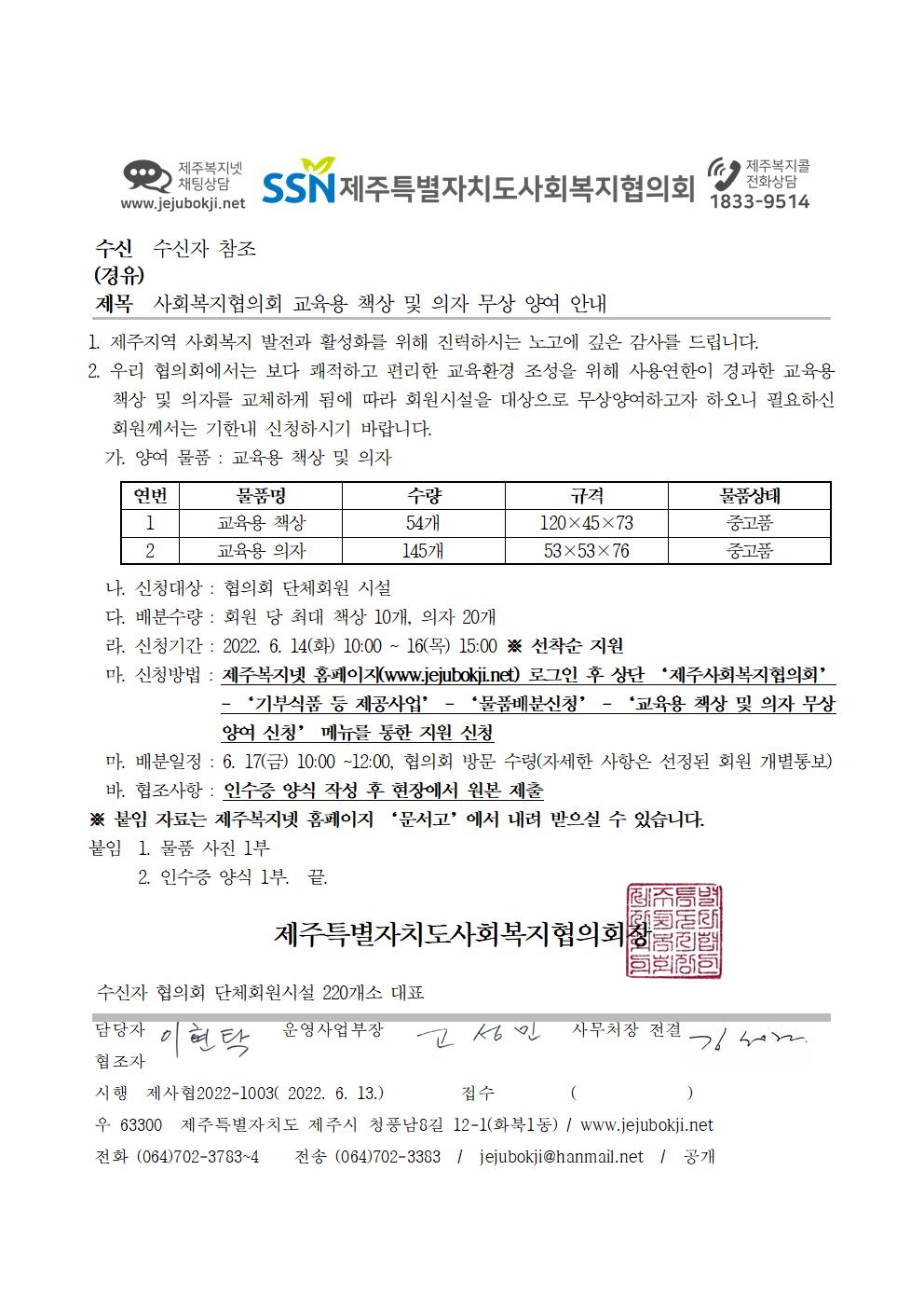 교육용 책상 및 의자 무상 양여 신청 안내