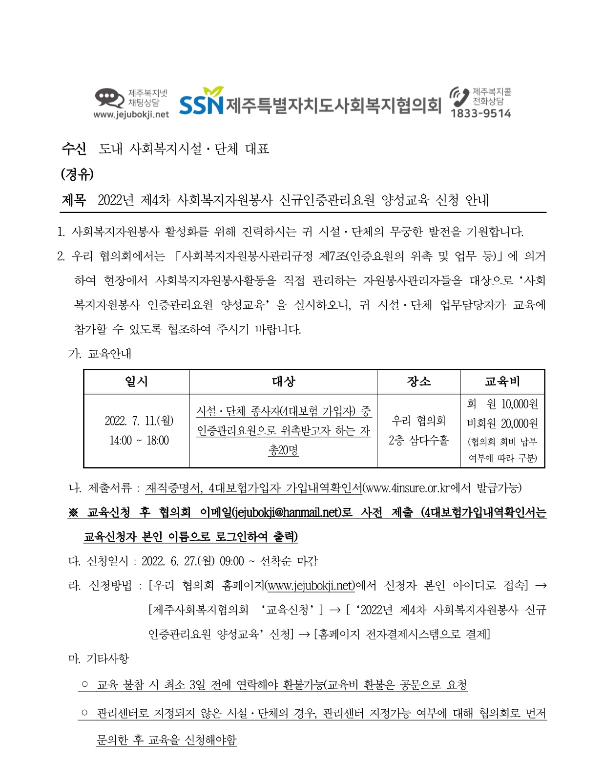 2022년 4차 사회복지자원봉사 신규인증관리요원 양성교육 신청 안내