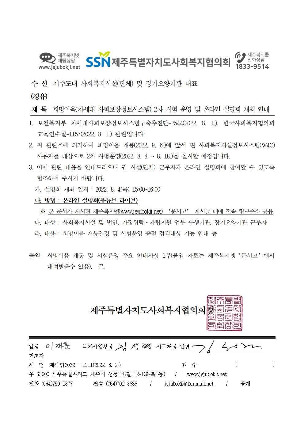 희망이음 시스템 2차 시험 운영 및 온라인 설명회(8. 4. / 15:00 ~ 16:00) 참여 링크주소