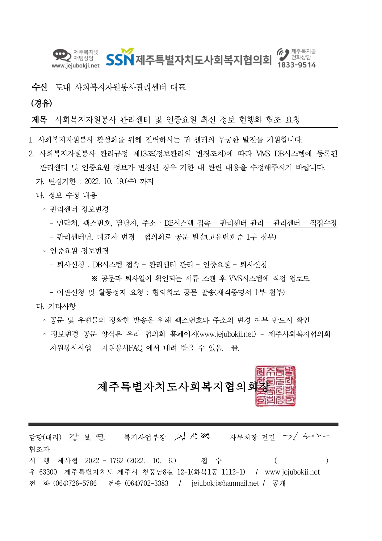 사회복지자원봉사 관리센터 및 인증요원 최신 정보 현행화 협조 요청