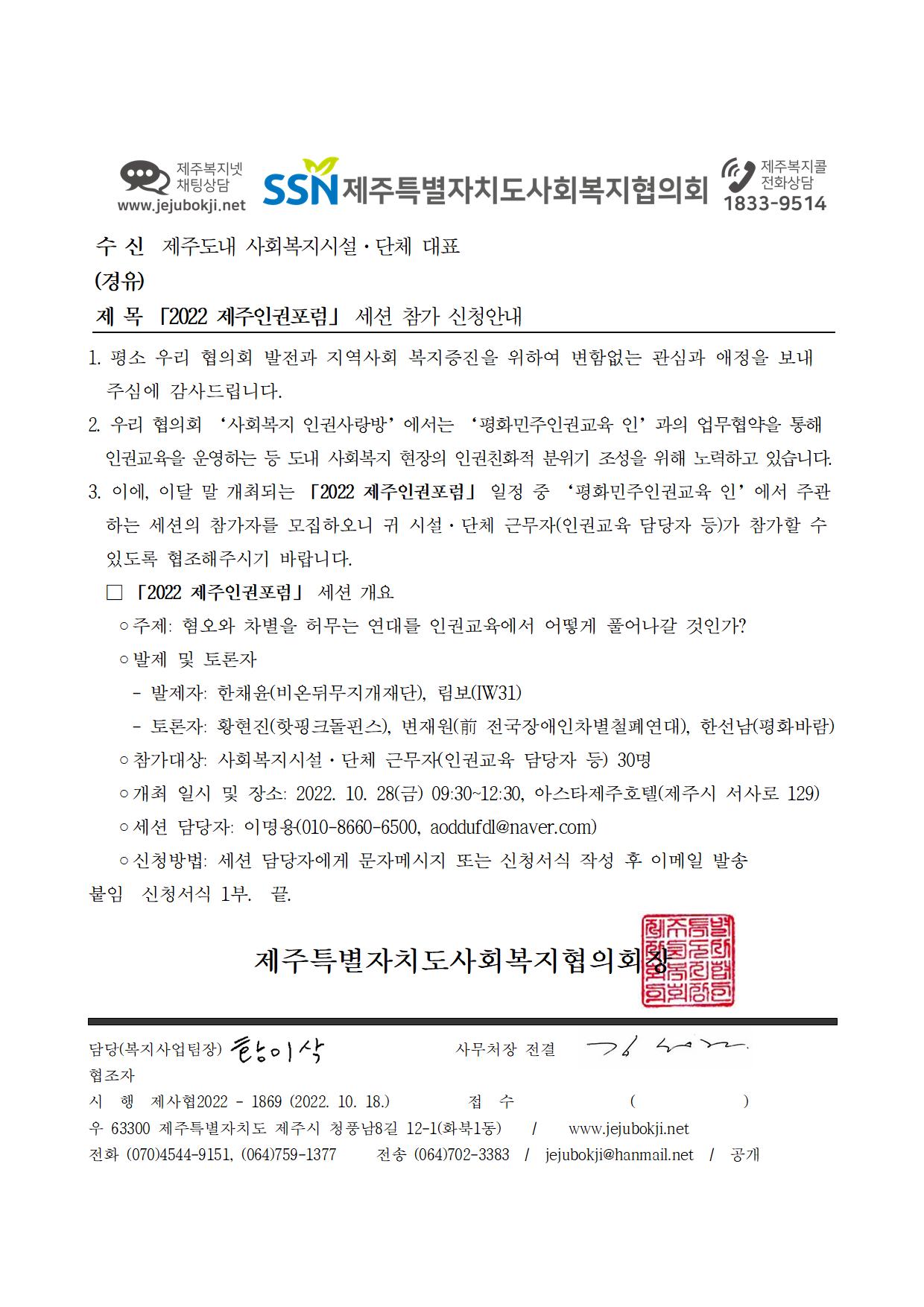 「2022 제주인권포럼」 세션 참가 신청안내