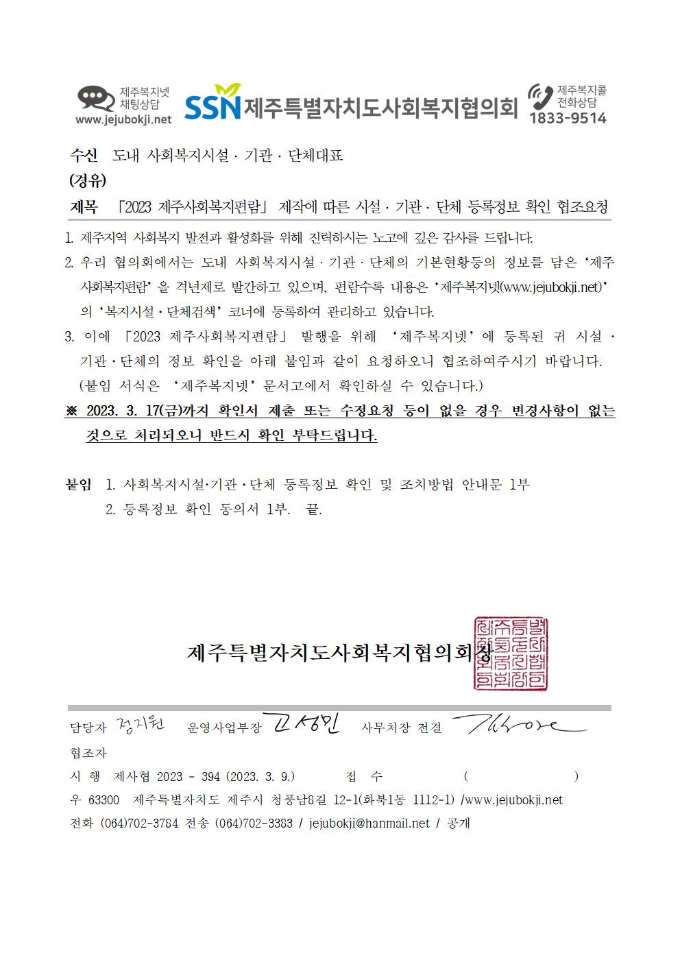 「2023 제주사회복지편람」 제작에 따른 정보 확인 협조요청