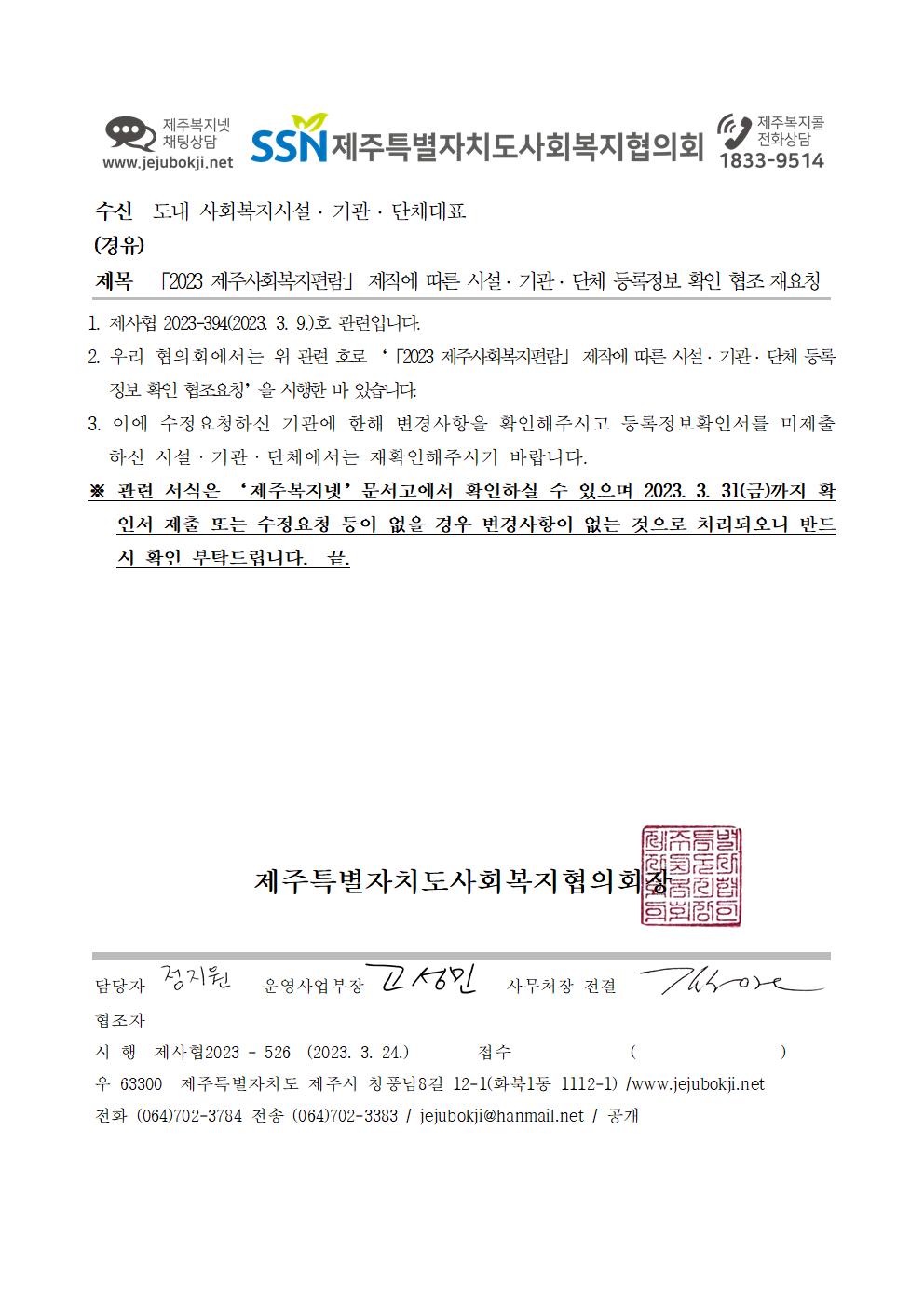 「2023 제주사회복지편람」 제작에 따른 시설 · 기관 · 단체 등록정보 확인 협조 재요청