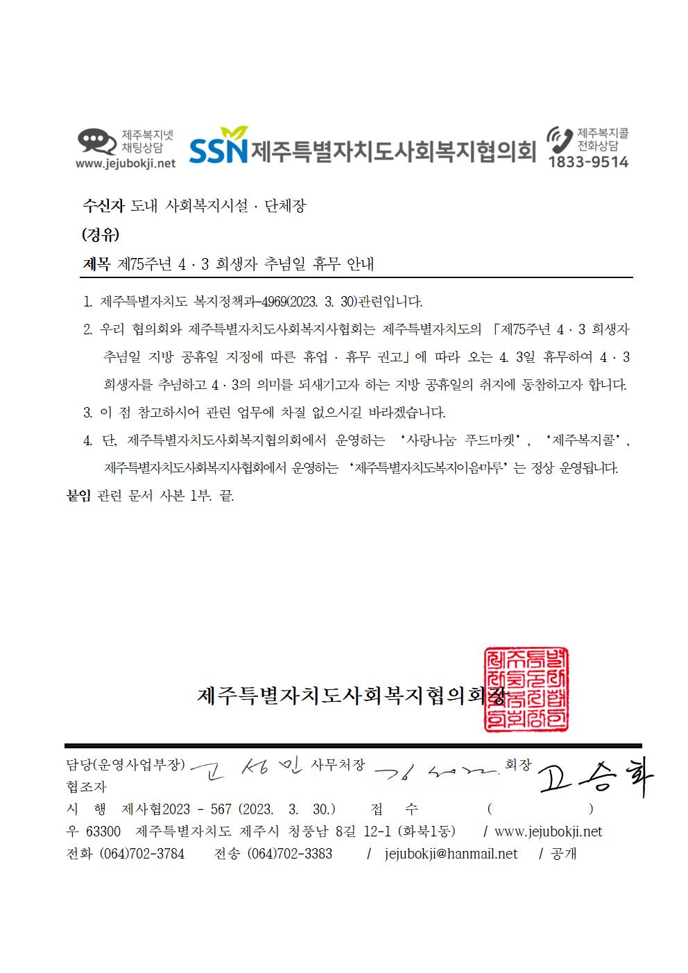 제75주년 4 · 3 희생자 추념일 휴무 안내
