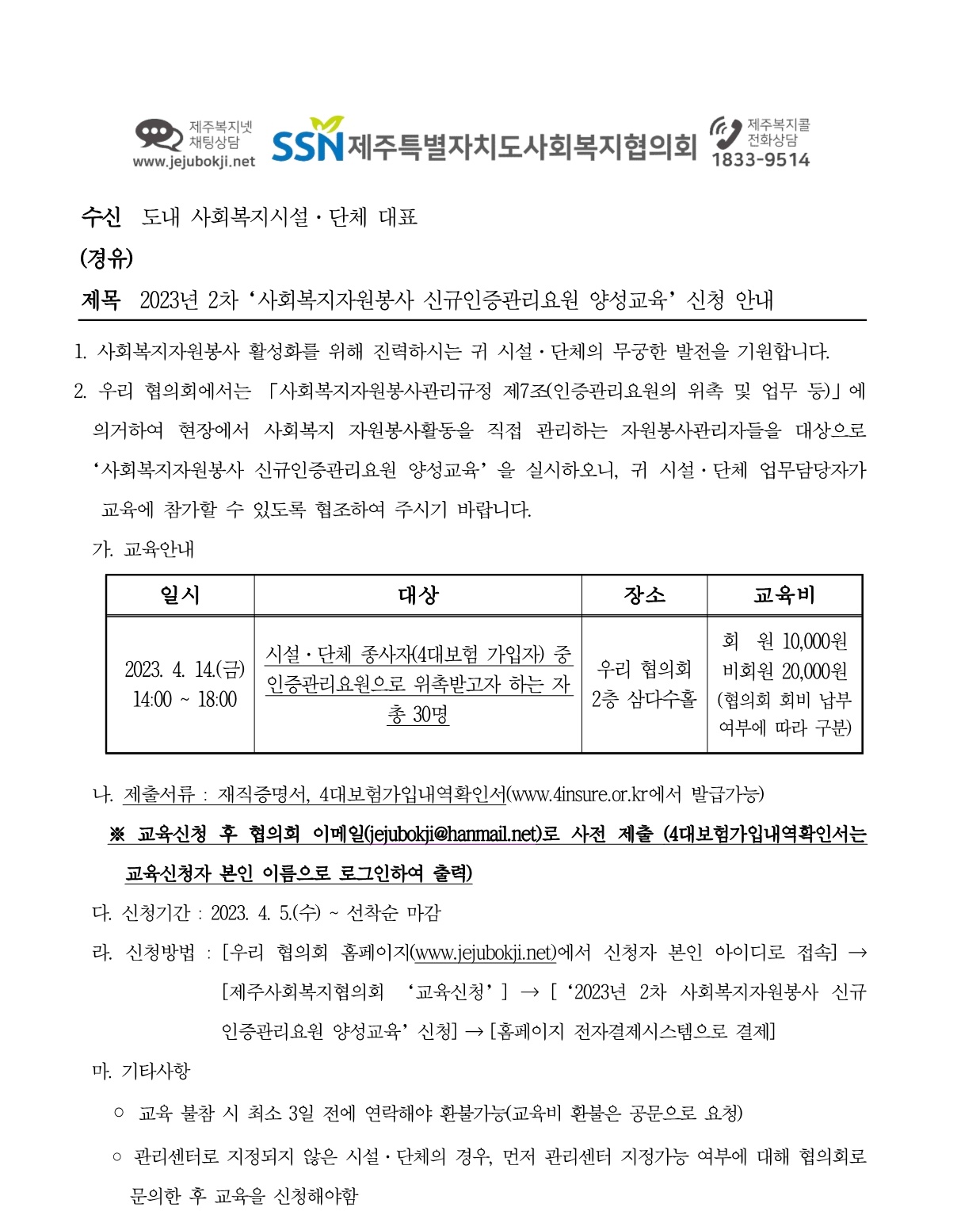2023년 2차 사회복지자원봉사 신규인증관리요원 양성교육 신청 안내
