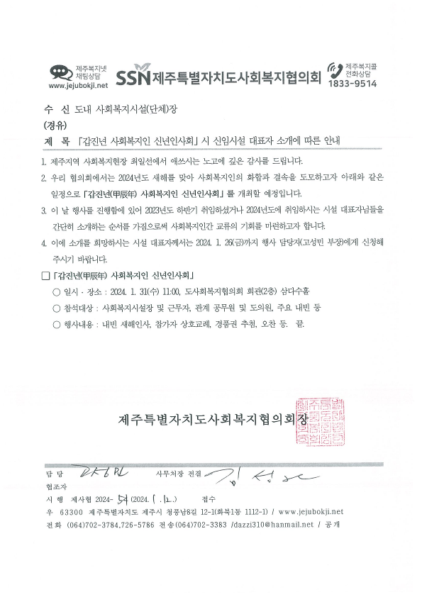 「갑진년 사회복지인 신년인사회」 신임시설 대표자 소개에 따른 안내