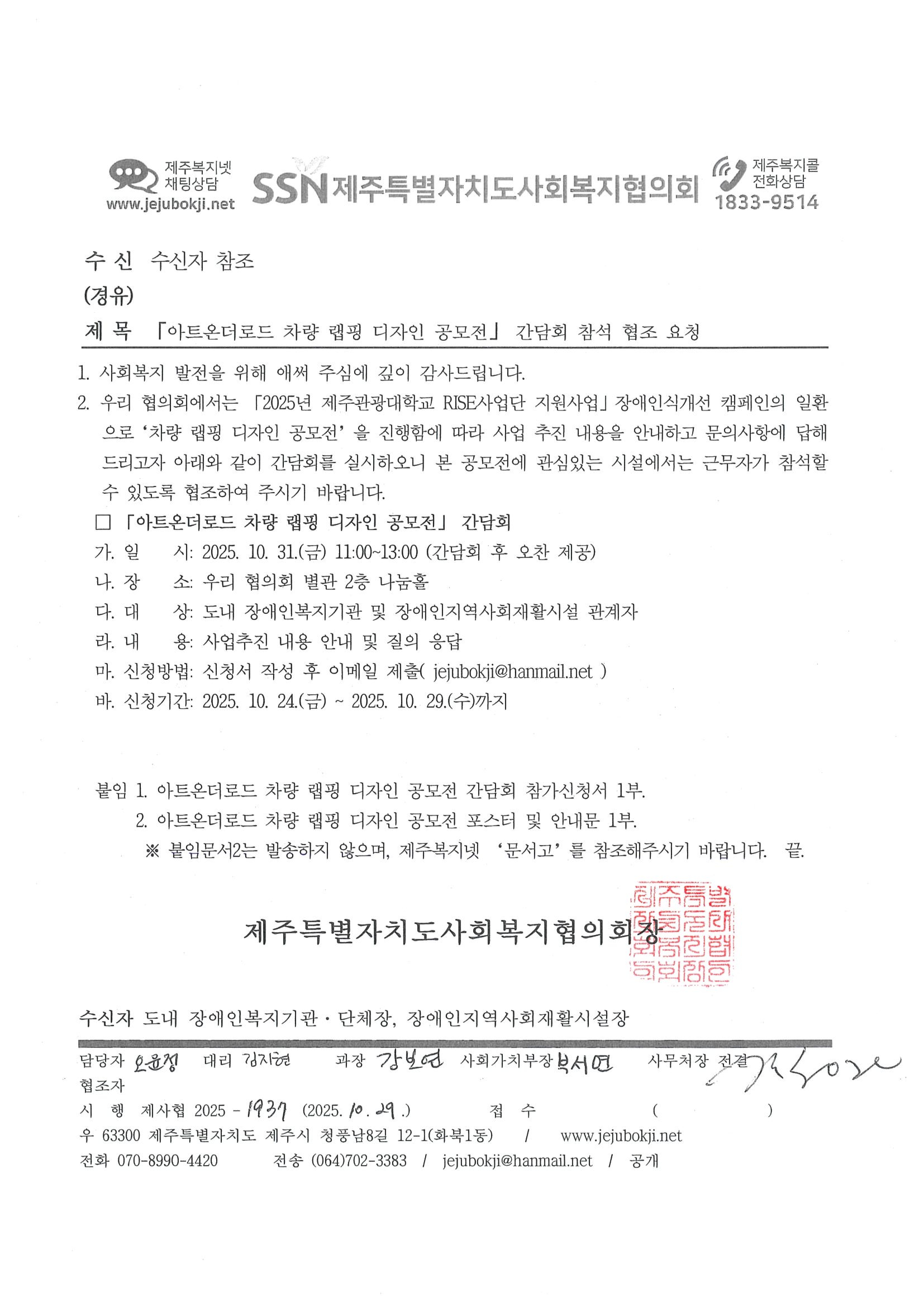 우리 협의회에서는 '아트온더로드 차량 랩핑 디자인 공모전 ' 에 대한 사업 추진 내용 안내 및 질의 응답 시간을 갖고자 간담회를 실시할 예정입니다. 관심있는 시설에서는 관계자가 참석할 수 있도록 협조하여 주시기 바랍니다.