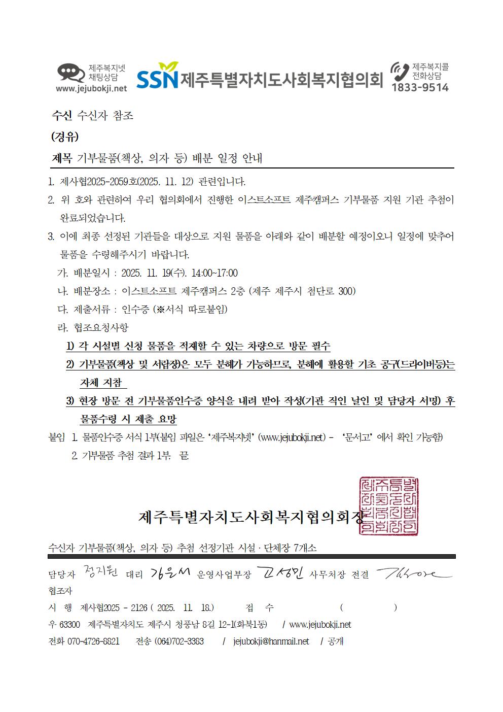 이스트소프트 제주캠퍼스 지원 기부물품(책상, 의자 등) 배분 일정 안내