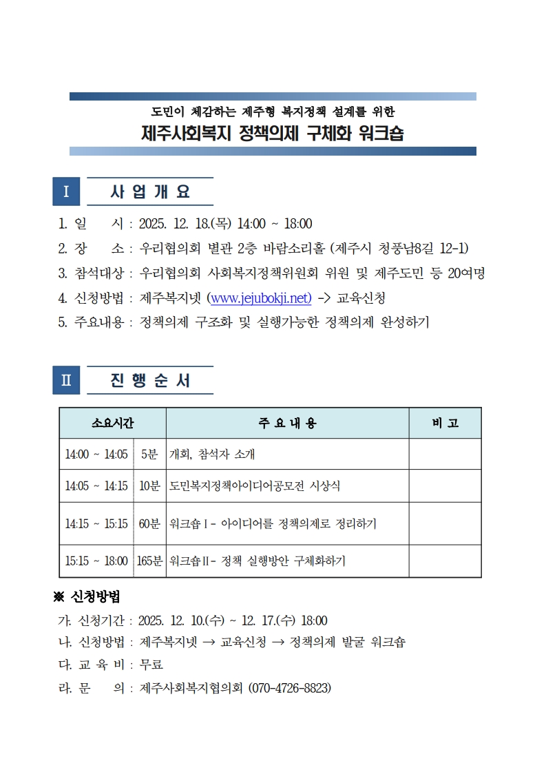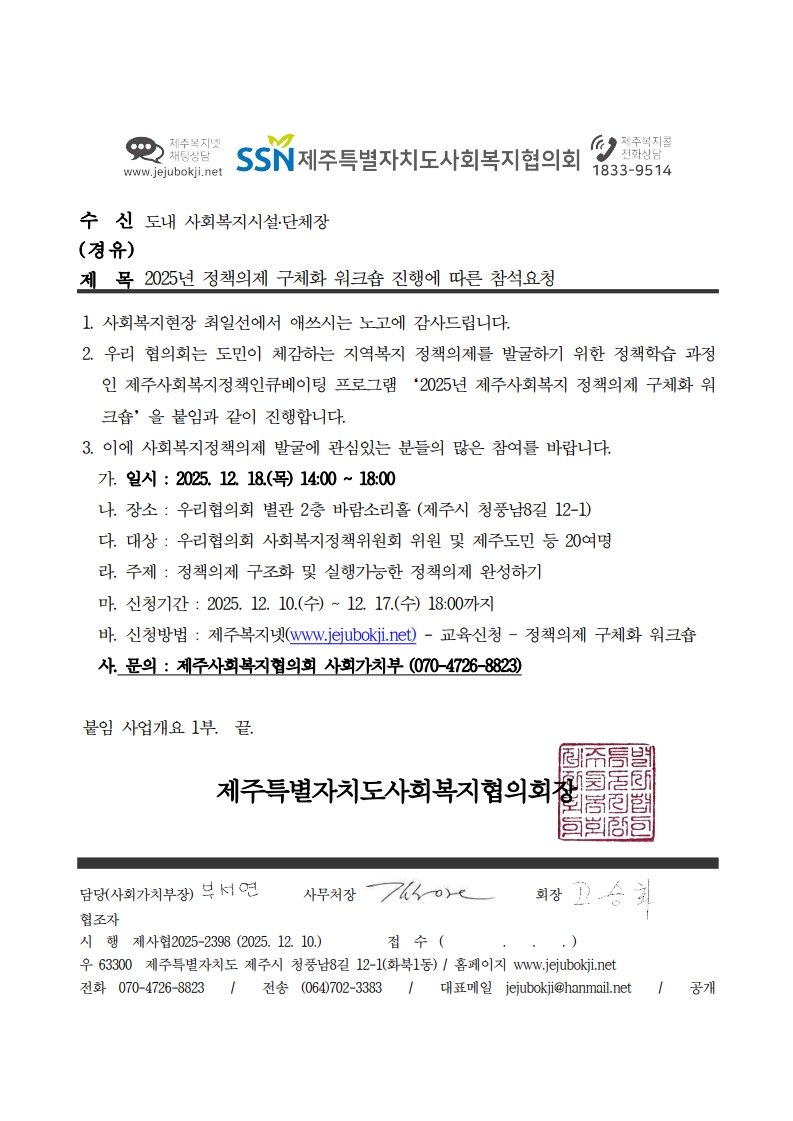 2025년 제주사회복지 정책의제 구체화 워크숍 참석요청