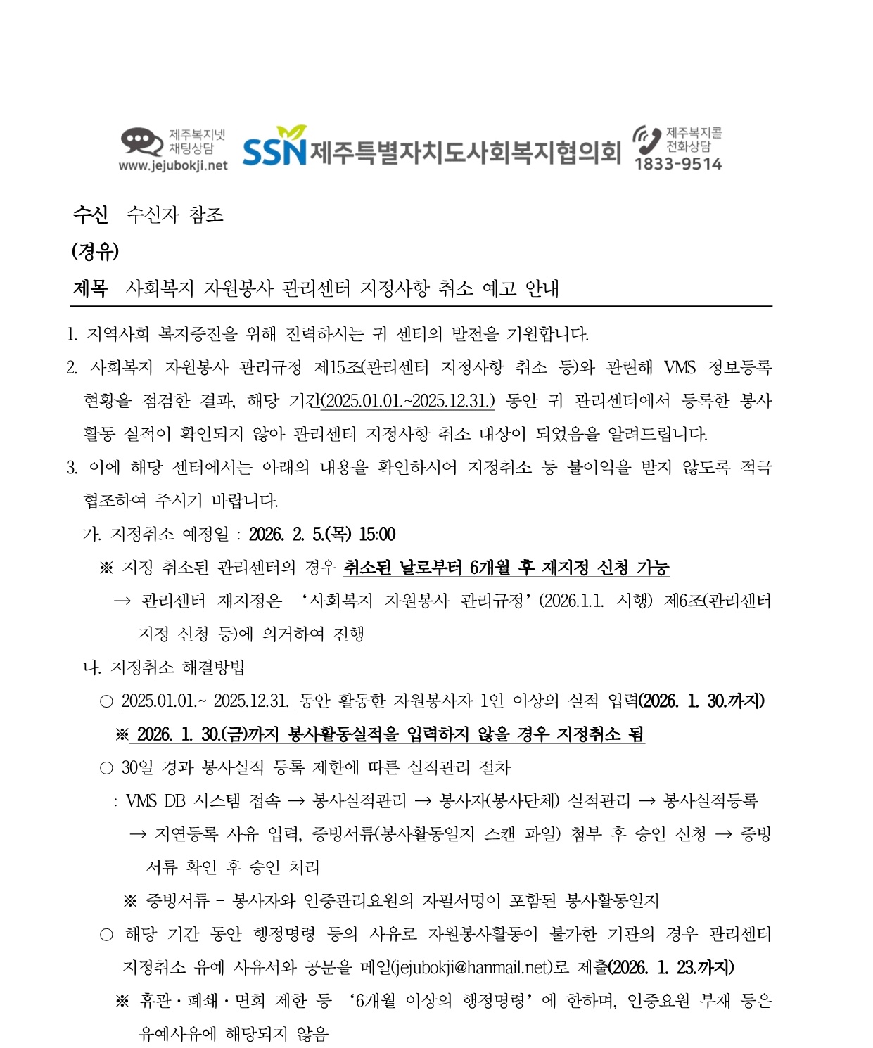 사회복지 자원봉사 관리센터 지정사항 취소 예고 안내
