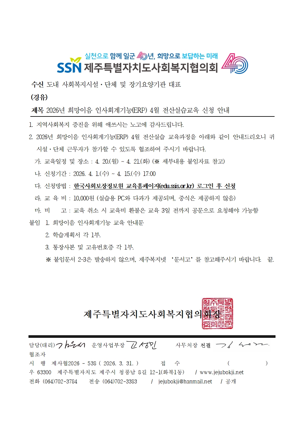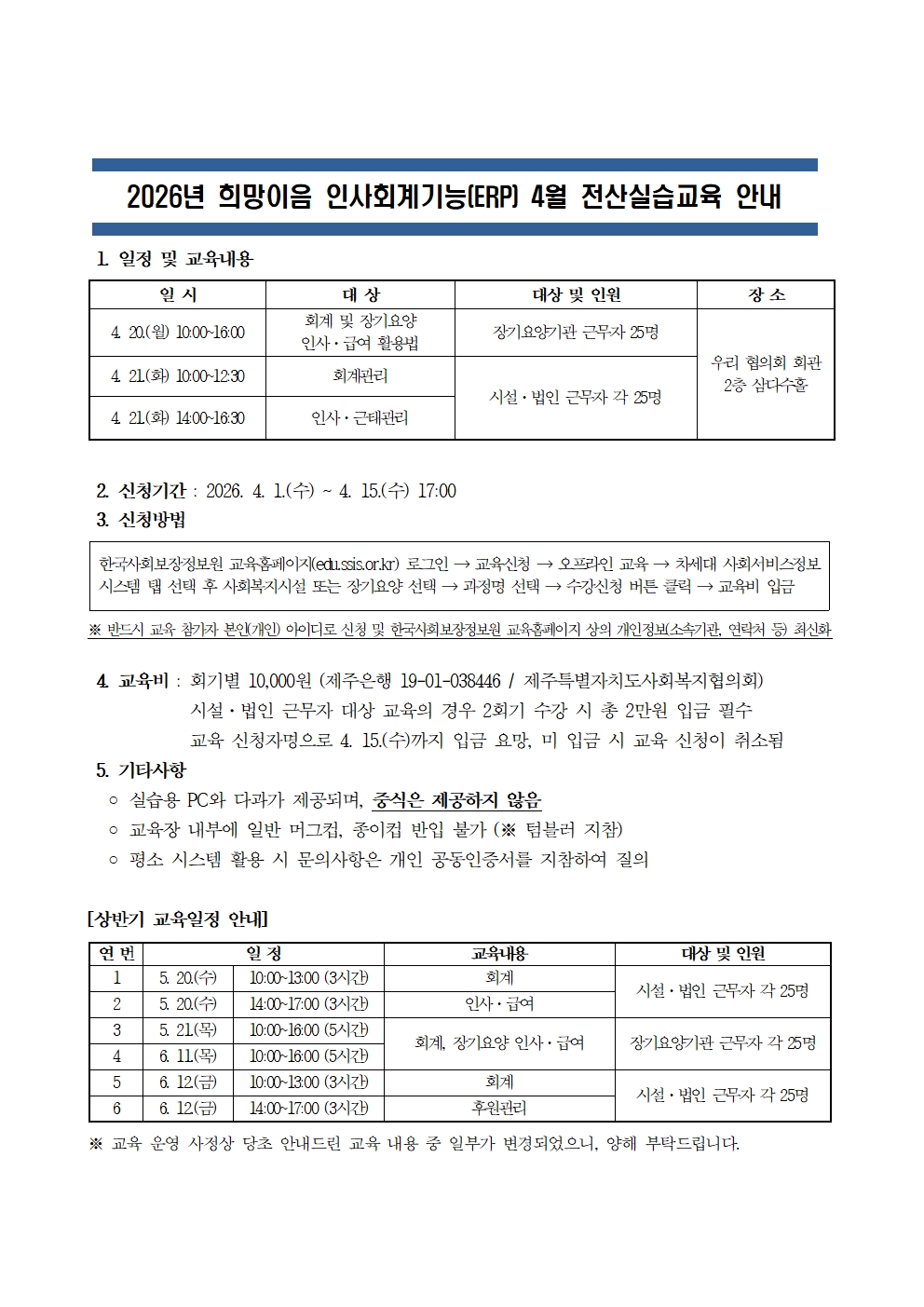 2026년 희망이음 인사회계기능(ERP) 4월 전산실습교육 신청 안내
