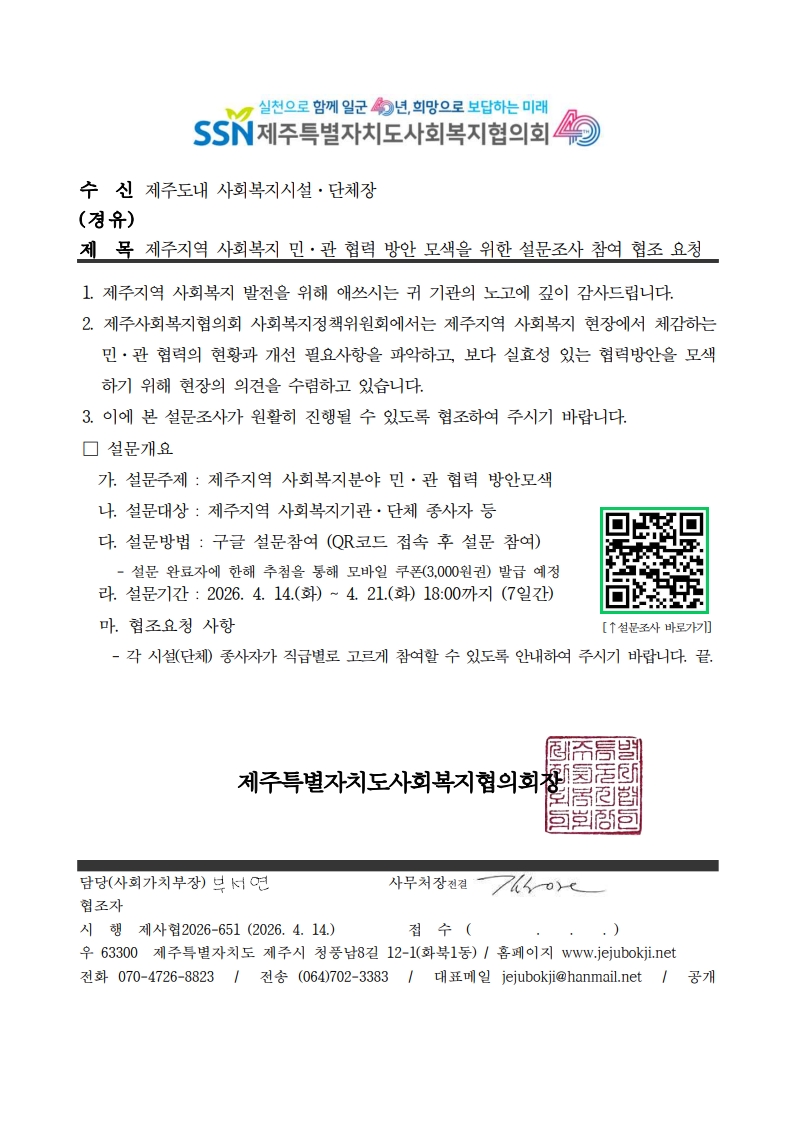 제주지역 사회복지 민·관 협력 방안 모색을 위한 설문조사 참여 협조 요청