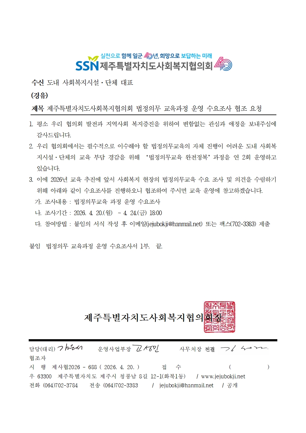제주특별자치도사회복지협의회 법정의무 교육과정 운영 수요조사 협조 요청
