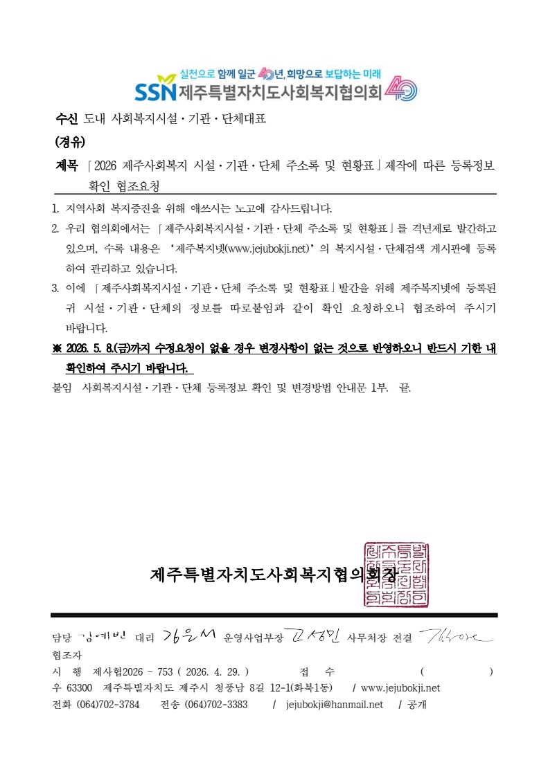 「2026 제주사회복지 시설·기관·단체 주소록 및 현황표」제작에 따른 등록정보 확인 협조요청