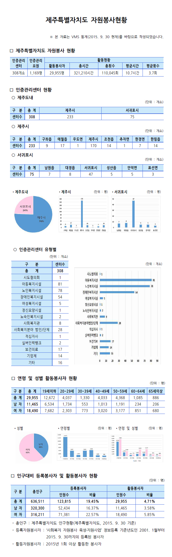 제주특별자치도 자원봉사현황(2015. 9. 30 기준)