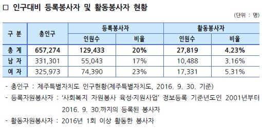 제주특별자치도 자원봉사현황(2016. 9. 30. 기준)