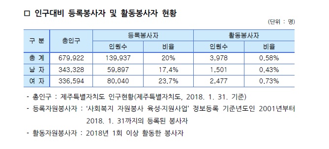 제주특별자치도 자원봉사현황(2018. 1. 31. 기준)