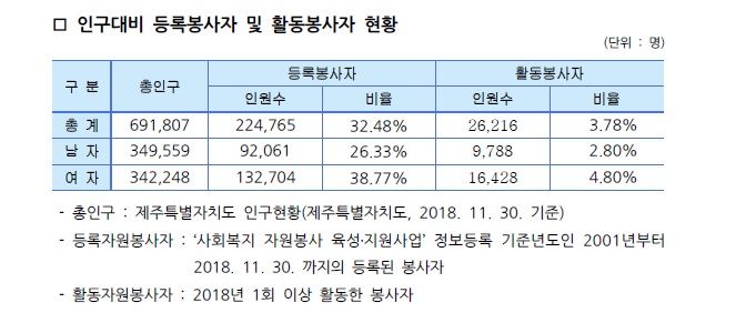 제주특별자치도 자원봉사현황(2018. 11. 30 기준)