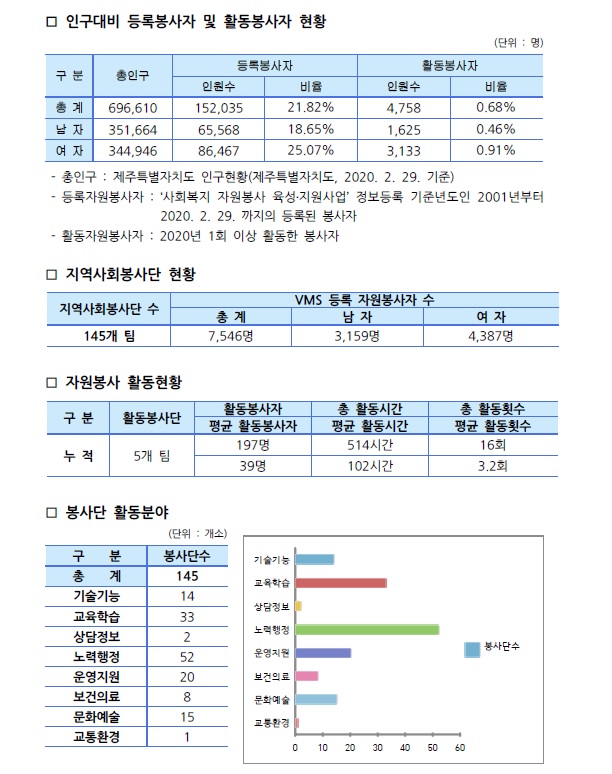 제주특별자치도 자원봉사현황(2020. 2. 29 기준)