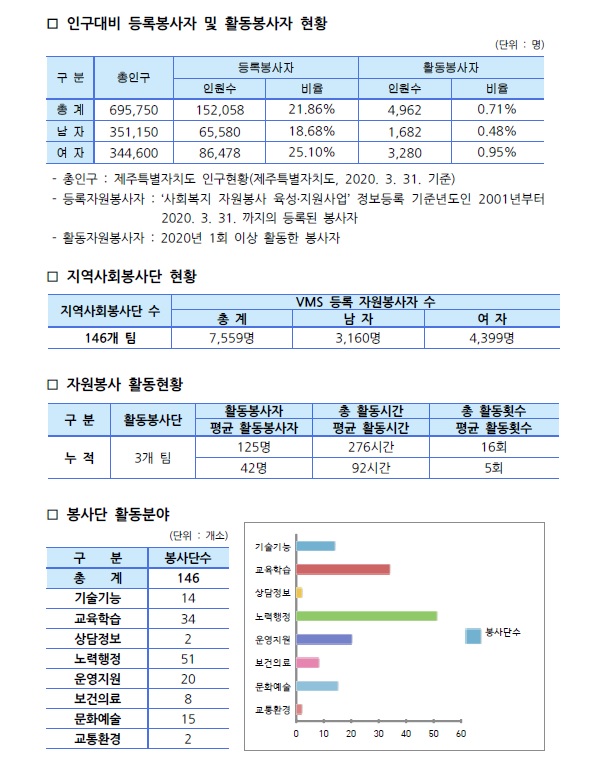 제주특별자치도 자원봉사현황(2020. 3. 31 기준)