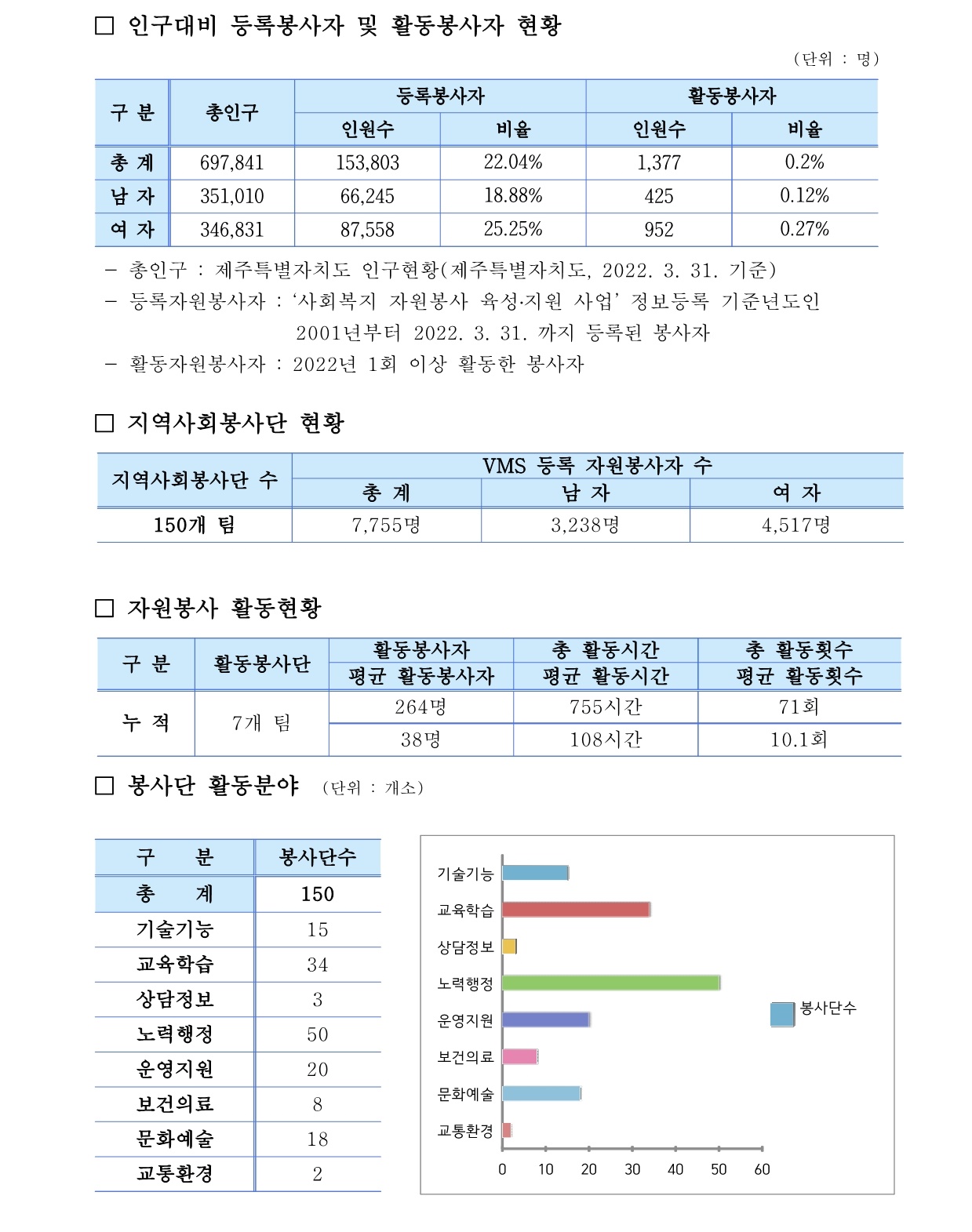 제주특별자치도 자원봉사현황 (2022. 3. 31 기준)