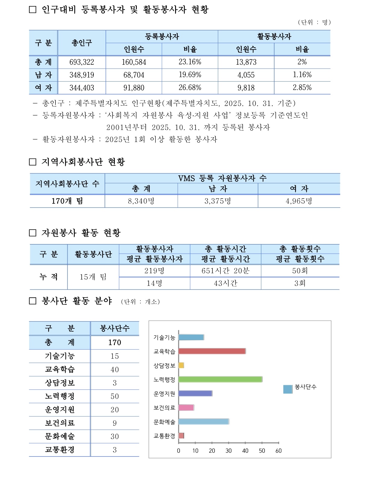 제주특별자치도 자원봉사현황 (2025. 10. 31. 기준)