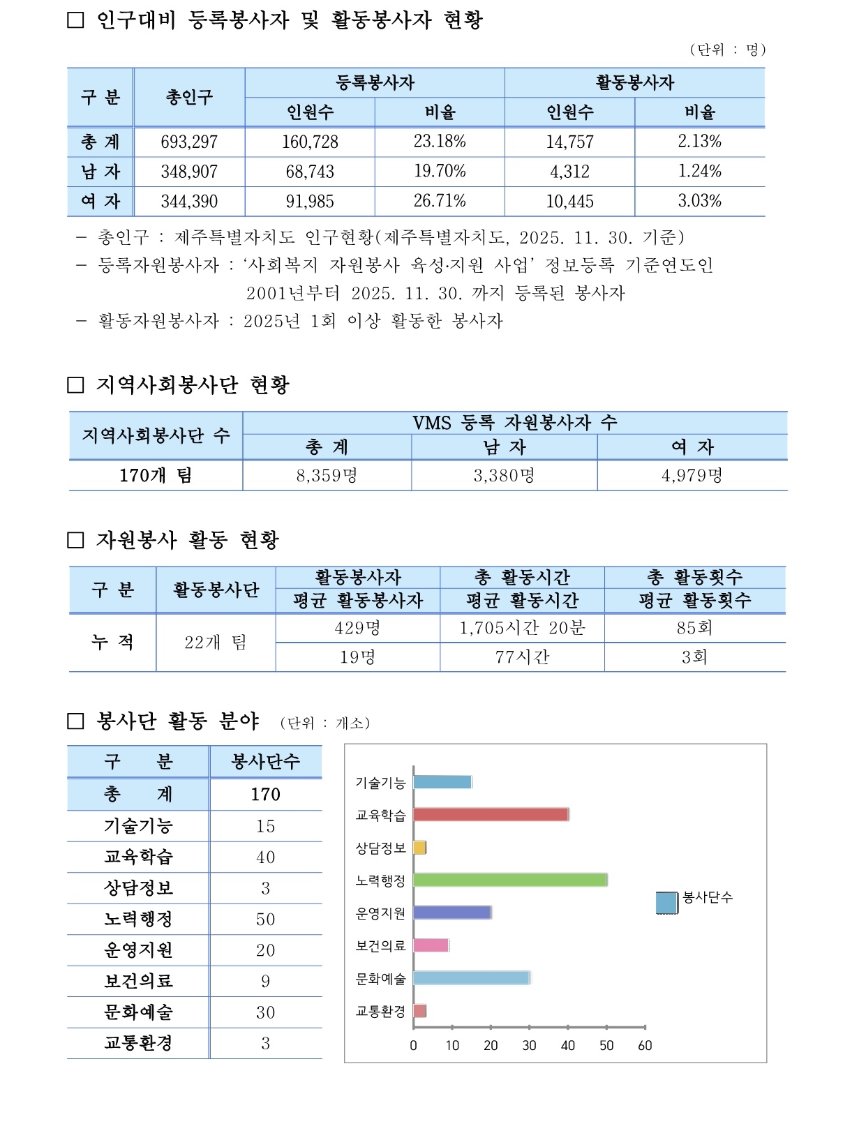 제주특별자치도 자원봉사 현황 (2025. 11. 30. 기준)