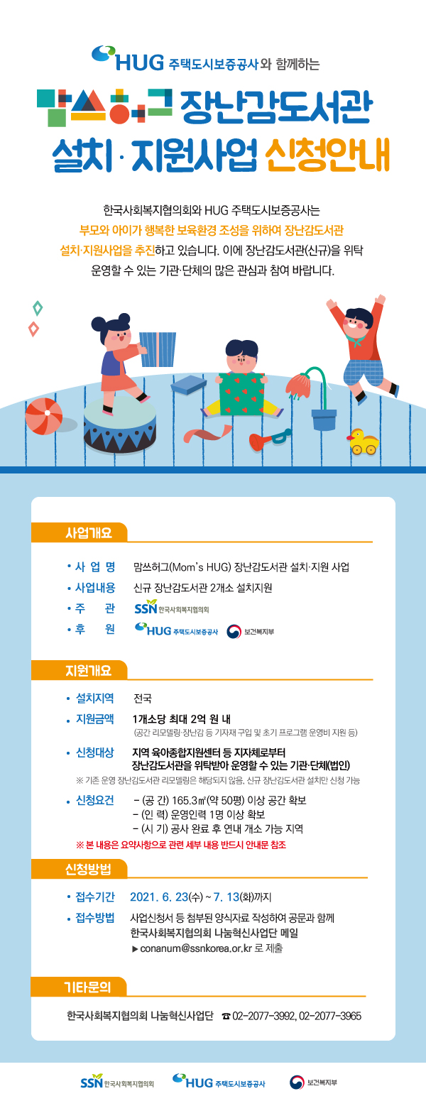 한국사회복지협의회는 HUG 주택도시보증공사와 함께 부모와 아이가 행복한 보육환경 조성을 위한 「2021년 맘쓰허그 장난감도서관 설치·지원사업」을 추진합니다. 관심있는 기관(단체)에서는 기한내 신청하여 주시기 바랍니다.