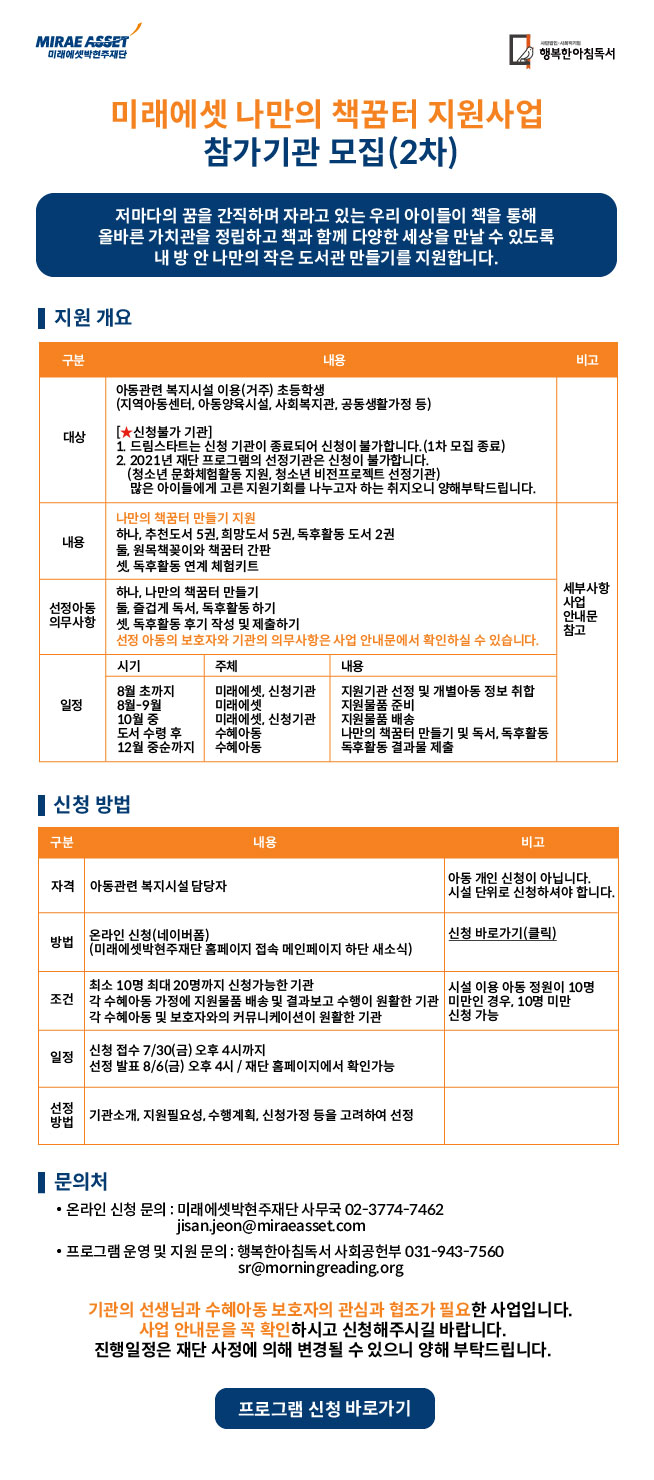 [미래에셋] 나만의 책꿈터 지원사업 참가기관 모집(2차) (7. 30. 16:00까지)